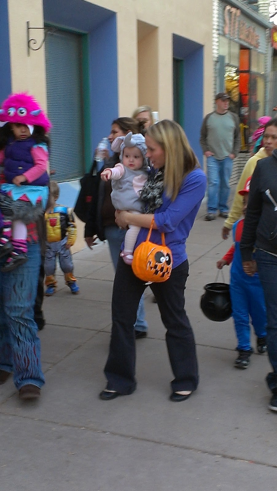 We went back to the Wash Park street party like last year. This time I got to walk around and go up to the shops for trick or treating. I think I know at least three people who thought I was the cutest elephant there. Last year I went as a lady bug to play off my last name. What will next year bring. I also want to note that Daddy wore the same outfit as last year.